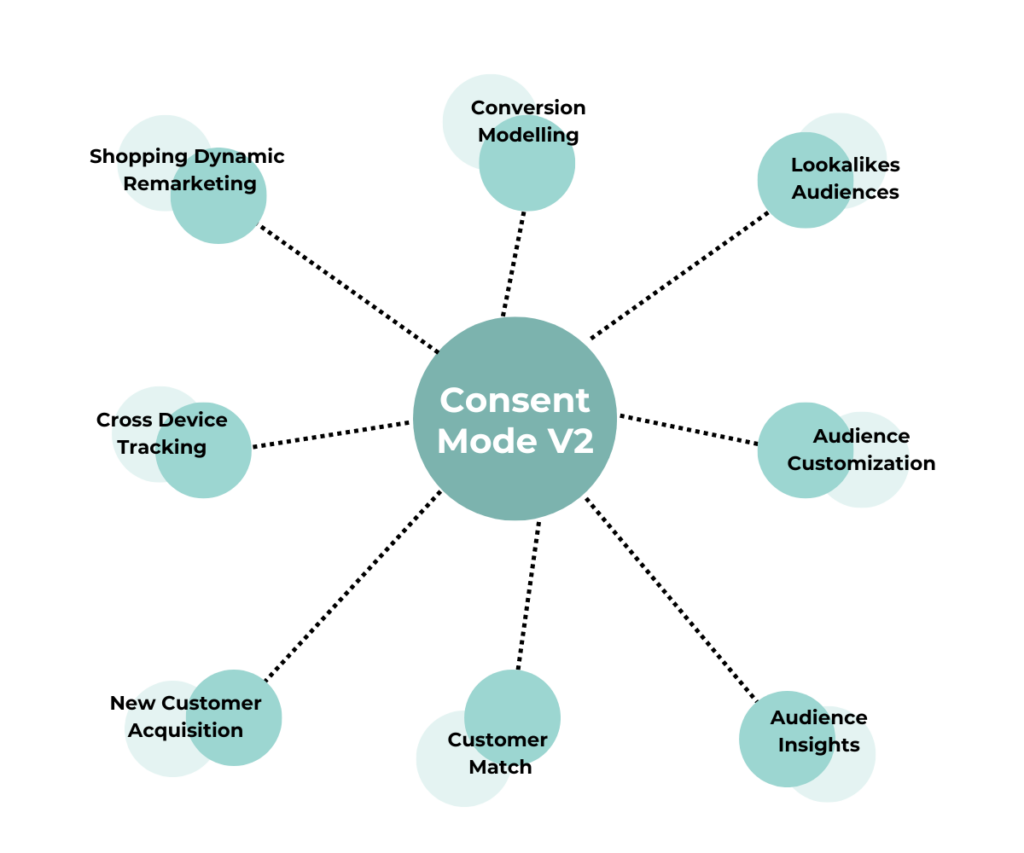 The benefits of Consent Mode V2 are numerous. Implementing Consent Mode V2 will improve: Shopping Dynamic Remarketing, Conversion Modeling, Lookalike Audiences, Cross-Device Tracking, Audience Customization, New Customer Acquisition, Customer Match, Audience Insights.