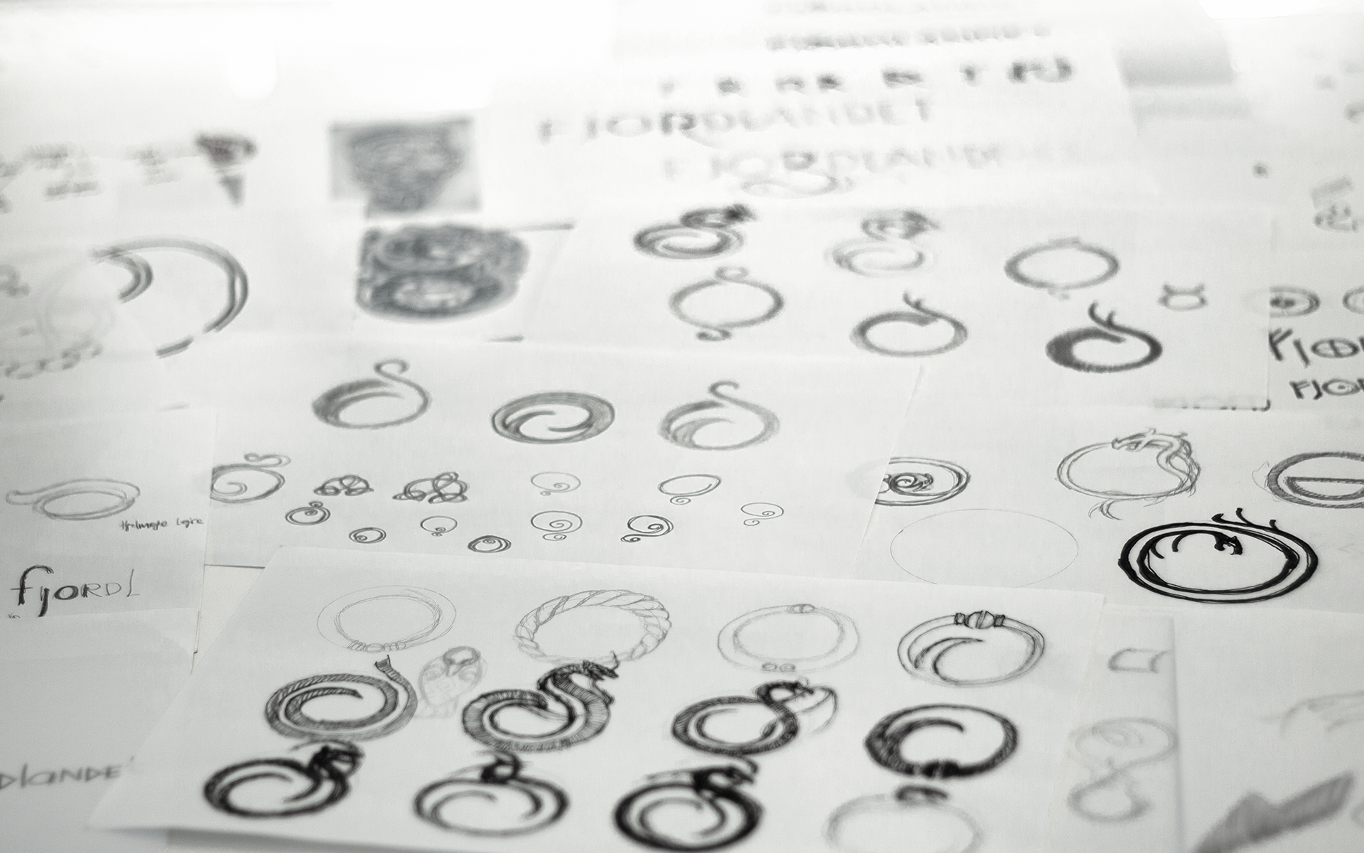 During the strategy work, two words came into focus: Viking and fjord. Due to the central significance of the Vikings and the fjords for the area and its self-understanding, we designed the “o” inspired by forms found in Viking ornamentation, Viking jewelry, and the prows of the Viking ships, which are a major attraction in Fjordlandet today. The “o” can also evoke associations with water and movement, a wave, or an entrance to a fjord in a stylistic form. The other letters are cut diagonally, as if carved in wood or chiseled in stone.